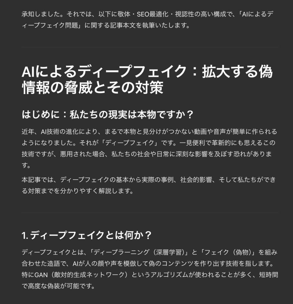 構成案・見出し・導入文まで一気に提案してくれて、まさに「プロの下書き」って感じ。