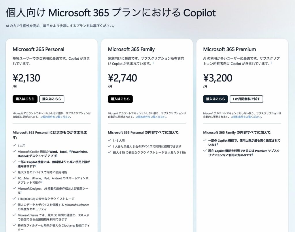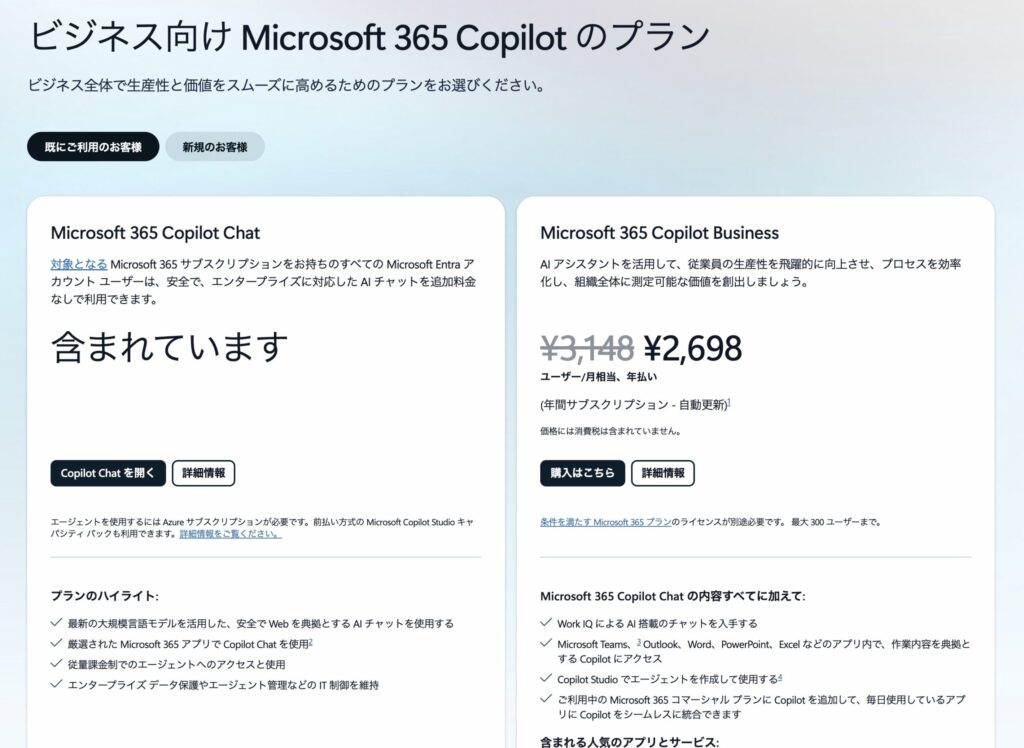 • Microsoft 365 Copilot Business: 月額 2,698円(年払い)/ ユーザー