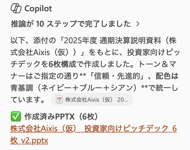• 指示プロンプト 「添付の決算資料をもとに、投資家向けのピッチデック(スライド資料)を6枚構成で作成してください。トーン&マナーは『信頼・先進的』で青を基調とすること。」