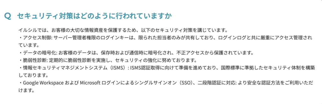 標準的: Google/Microsoftログイン対応、通信の暗号化など基本的な対策はされています。ISMS認証は「取得準備中」とのこと。