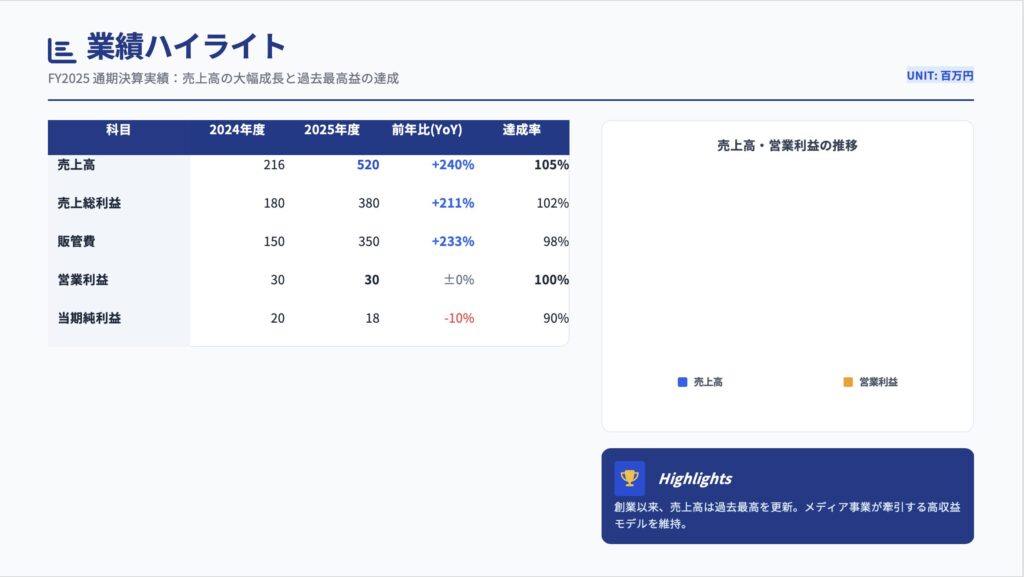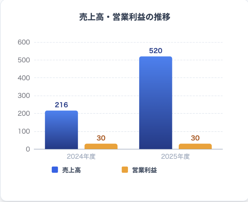• 売上・利益推移: 2024年度(2.16億円)と2025年度(5.20億円)の棒グラフが、数値通りの比率で正確に描画されています。
