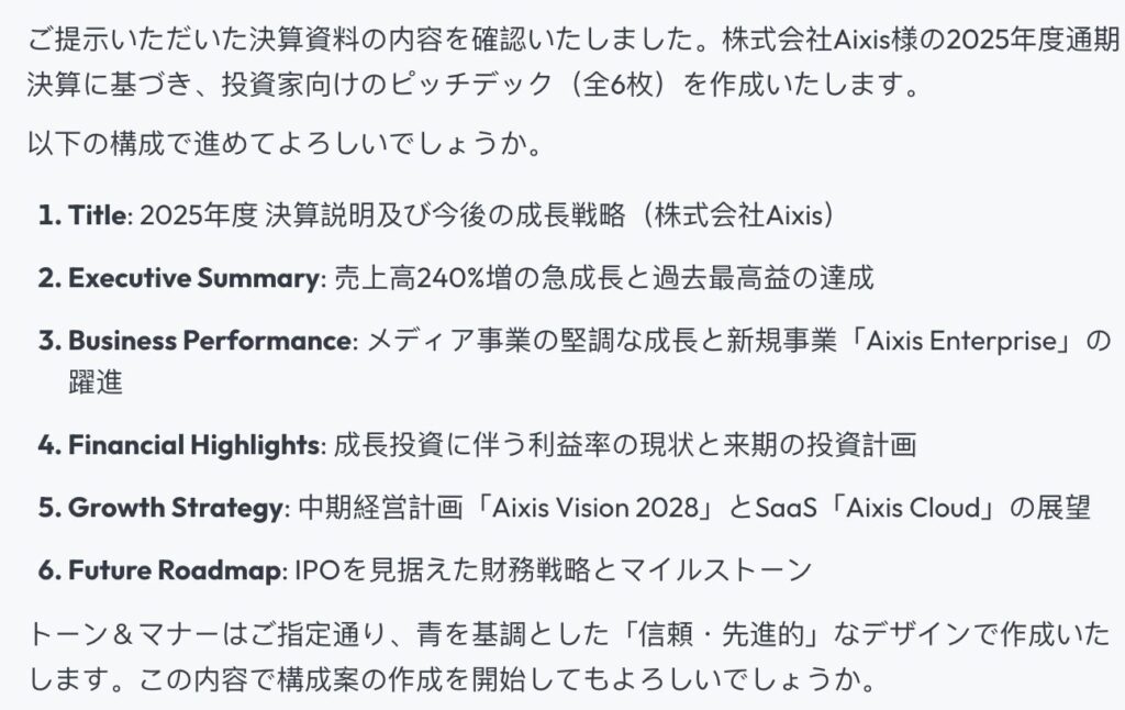 • 指示プロンプト 「添付の決算資料をもとに、投資家向けのピッチデック(スライド資料)を6枚構成で作成してください。トーン&マナーは『信頼・先進的』で青を基調とすること。」