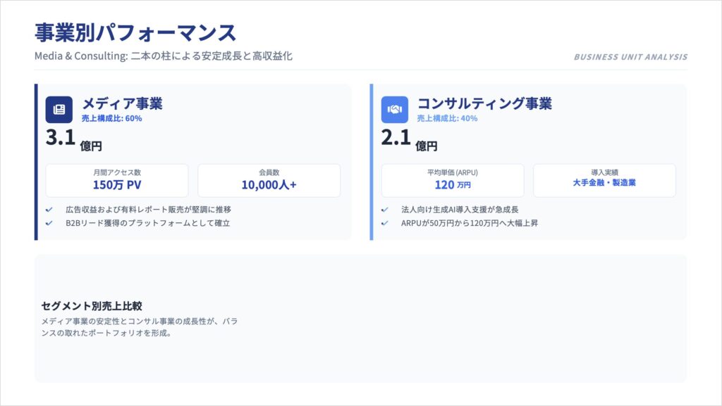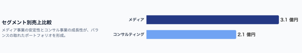 • セグメント比較: メディア事業とコンサル事業の売上対比も完璧です。